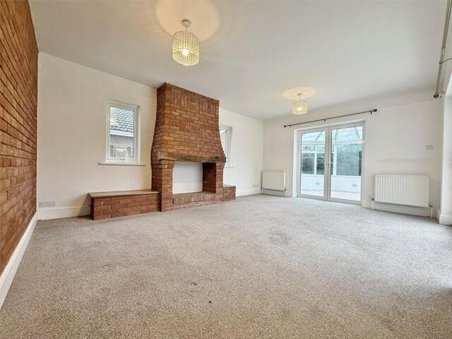 FAMILY ROOM Feature brick fireplace with display plinths on either side with windows above, two radiators, double glazed sliding patio doors to the rear garden, large opening to the kitchen/breakfast room and double opening doors to: