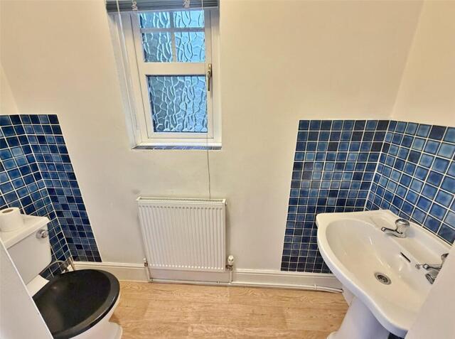 GROUND FLOOR WC White suite comprising pedestal wash hand basin and push button WC. Window to the front elevation, radiator, wood effect flooring and part tiled walls.