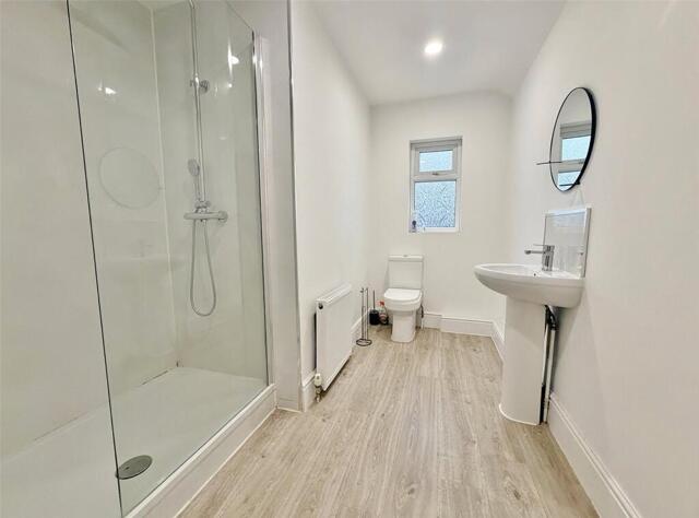 EN-SUITE SHOWER ROOM White suite comprising push button WC, pedestal wash hand basin with splashback and walk in shower with glazed screen and fitted shower. Wood effect flooring, radiator and window to the rear elevation.